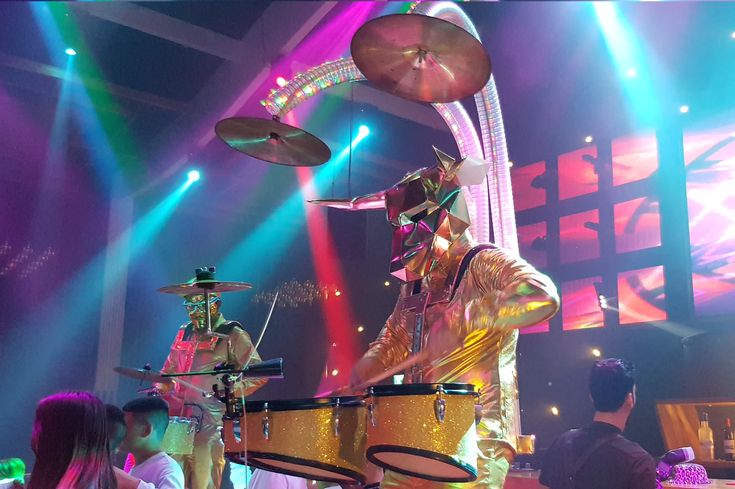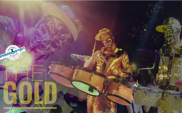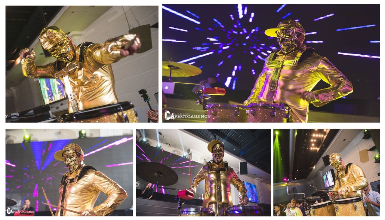 מתופפים בזהב במרכז הרחבה על פודיומים מזהב וסט כלי הקשה שיצרנו במיוחד עבור המופע